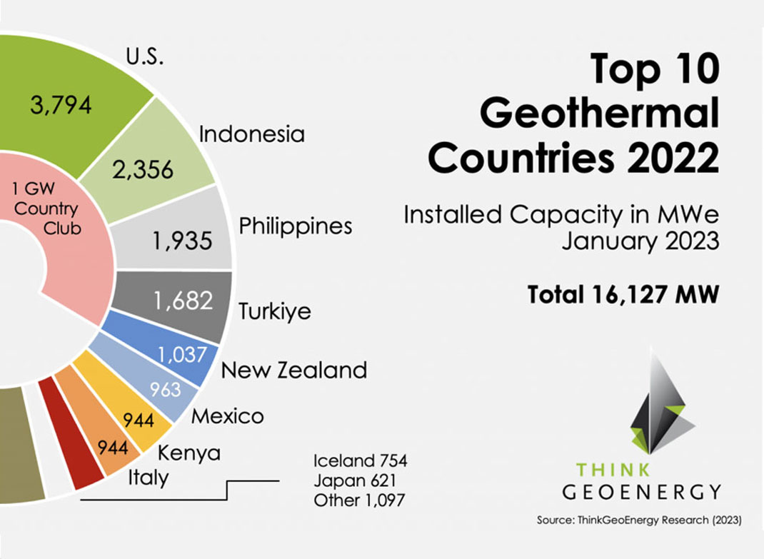 Con el mundo aparentemente volviendo a la normalidad después del covid, el crecimiento general de la capacidad de generación de energía geotérmica sigue siendo bajo. Solo 8 países agregaron capacidad de generación de energía geotérmica con un total de 16 plantas adicionales. Kenia (83 MW), Indonesia (80 MW) y EE. UU. (72 MW) mostraron el mayor crecimiento. Nicaragua vio la adición de 10,4 MW justo antes de fin de año. Se informaron otras adiciones en China, Filipinas y Japón. La capacidad total instalada de generación de energía geotérmica a fines de 2022 fue de 16.127 MW, un aumento de 286 MW con respecto a 2021. Aquí el Top 10 de países geotérmicos a fin de año 2022: