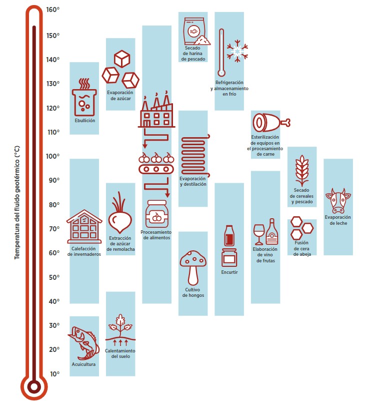 El calor geotérmico también se utiliza para aumentar la productividad de diferentes aplicaciones, como la calefacción de invernaderos, la acuicultura ? y el procesamiento de alimentos, entre otras formas de valor agregado.